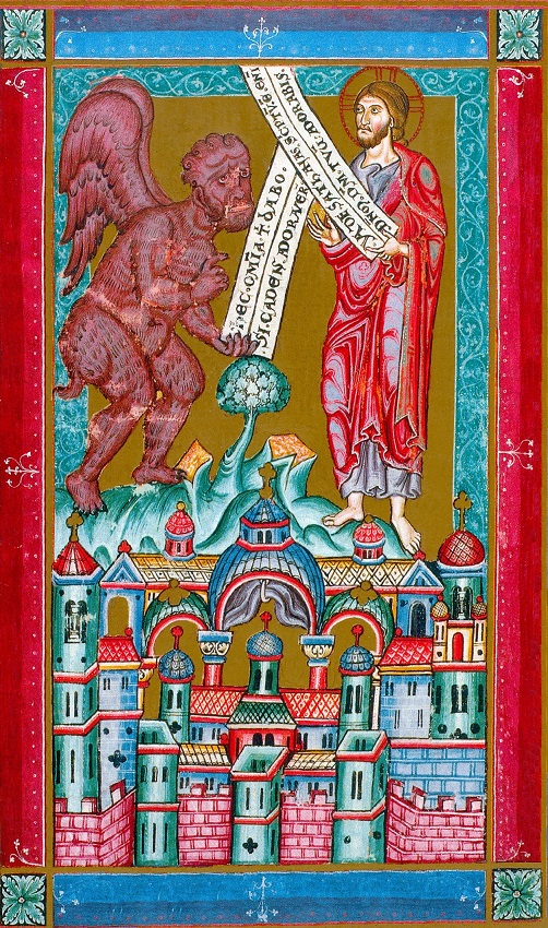 En este mes de marzo, siguiendo la liturgia, se presentan dos imágenes que, aunque son muy diferentes en cuanto a la época y estilo de su realización, se complementan entre sí, puesto que en la primera se puede contemplar el inicio de la tercera tentación – en las cartelas aparece escrita la ‘oferta’ del tentador – y la segunda visualiza de forma evidente el desenlace final.