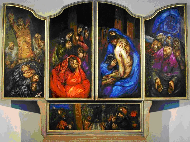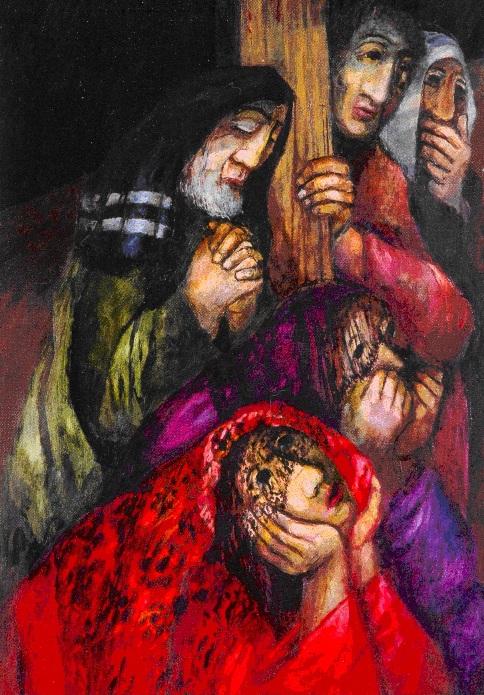 El párroco-pintor Sieger Köder nos la presenta en primer término con una túnica roja, el rojo es el color del amor, y una mantilla negra con la que quiere expresar la sacralidad del lugar. Está en actitud meditativa y mirando hacia arriba, hacia Jesús Crucificado, recordando quizás aquellas palabras de Jesús: “Cuando Yo sea elevado sobre la tierra, atraeré a todos hacia Mí”. Pertenece desde el principio al grupo de discípulas que siguieron a Jesús y Le sirvieron más allá de Su muerte. Una mujer actual y adecuada para el futuro de la Iglesia y del mundo: valiente, creyente y fiel.