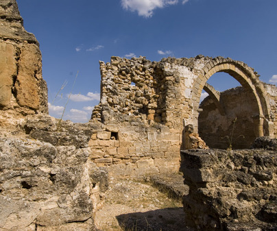 se conservan los restos del palacio, iglesia, puerta monumental,