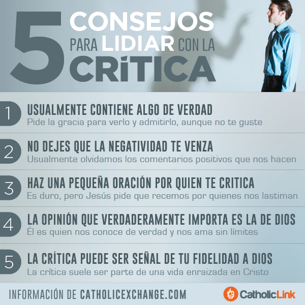 Por eso estos cinco consejos nos pueden ayudar a vencer esa primera reacción y conseguir que la critica se convierta en una oportunidad de mejora e incluso que lleguemos a valorarla y agradecerla. Qué difícil se me antoja esto último pero todo es posible con la ayuda del Espíritu Santo.