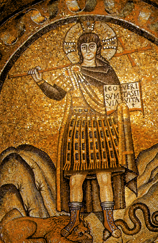 Bello mosaico con un Jesus jóven, sin barba. Vence (pisa, somete) el pecado (serpiente) y el poder (león). Y lleva la cruz, su gran victoria, en un hombro, atras, en efecto como el bordón (báculo) del peregrino, mostrando ese camino en las palabras de su vida (libro). Y su vestido, ¿de guerrero con capa?