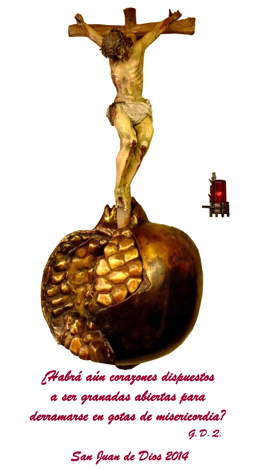 El bello Sagrario de la capilla de la Comunidad del Centro Asistencial de San Juan de Dios en Palencia, en el que una granada de bronce genera en su interior el espacio para la Reserva y es asiento para un expresivo Crucificado en madera, responde –en alguna medida a alguna pregunta– con una metáfora plástica. El carisma de Juan Ciudad anida en una Orden, ha de espolearla a la perfección y gritar la vigencia del mensaje: en el corazón de la granada habita la Misericordia.