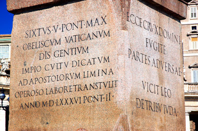 a su actual emplazamiento, y el 26 de septiembre de 1586 hizo grabar en su base de mármol una antigua formula de exorcismo: