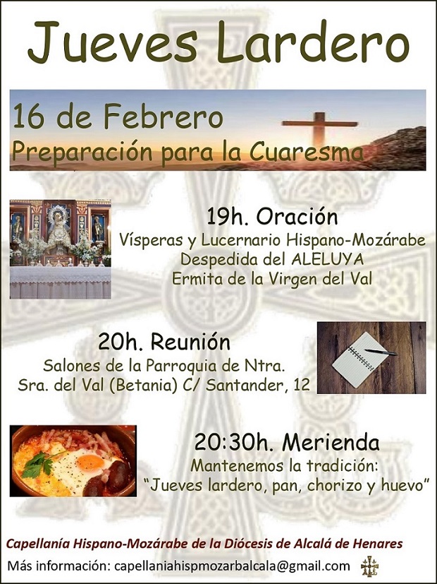 Un año más nuestros hermanos de Alcalá de Henares nos invitan a la celebración del Jueves Lardero para despedirnos de la carne hasta la Pascua (aunque solo sea los viernes y no todos los días de la cuaresma cómo los hispano-mozárabes de antaño).