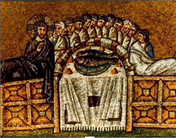 Fascinante la descripción del bello mosaico de la Ultima Cena con detalles y simbología poco conocidos: la colocación de los comensales, Cristo sentado a un lado y no en el centro, la mesa semicircular. Este último detalle adquiere otra dimensión al haber altares en forma de sigma. El hecho estar comiendo pescado con el auténtico «Cordero».