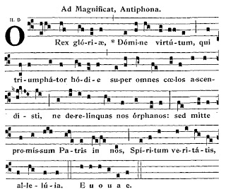 O Rex gloriae Posted on 17 mayo, 2015 por admin Tempus ascensionis Antífona Magnificat: Oh Rey de la gloria, Señor del universo, que hoy asciendes triunfante al cielo, no nos dejes huérfanos, envíanos desde el Padre tu promesa, el Espíritu de la verdad. Aleluya.