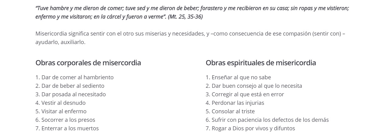 Es muy importante tener muy en cuenta estas obras, tanto las corporales – bastante sabidas – como las espirituales que quizás conocemos menos. Quién no falla a veces en la sexta – sufrir con paciencia los defectos de los demás!!