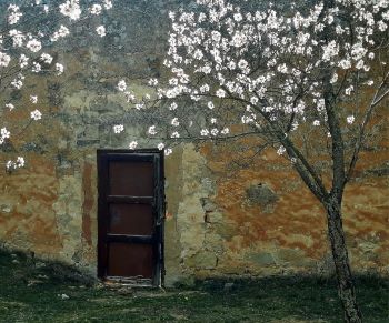 Resalto y copio del poema (mirando la foto del muro, la puerta y el almendro renacido en flor del huerto regado), » …en los labios renace la canción.