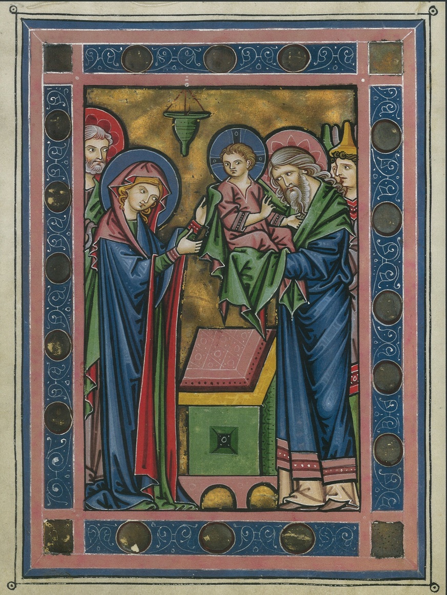 La Presentación de Jesús en el Templo clausura el ciclo pictórico introductorio de la Anunciación de María y de la Natividad. La tosca encuadernación del pergamino indica que la página siguiente fue cortada más tarde. Se puede suponer que la parte derecha de esta página estaba vacío y que en el dorso se hallaba una escena de la infancia de Cristo o de Su Bautismo. Por otro lado, la Presentación en el Templo cierra la primera parte de forma ideal. En esta imagen se halla contenida por completo la vida futura de Jesús: Simeón ha visto la salvación, Lc 2,29-31. Es de esta salvación de la que se trata en el ciclo de ilustraciones de los Salmos siguientes. A excepción de la inicial del primer Salmo, se trata de ilustraciones de la vida de Cristo, como sucesor de David. Los Salmos habituales le son atribuidos a él, incluso si han sido compuestos entre los siglos VI y III a. de C., es decir, mucho tiempo después de su reinado. Aquí se trata del cántico de Simeón (Nunc dimittis), uno de los cánticos del Nuevo Testamento junto con el Magnificat y el Benedictus. En el estado actual del manuscrito, la inicial ornamentada para el Salmo Beatus vir (Salmo 1), comprendiendo a David, tocando el arpa y a un campanero (ver la imagen de Agosto) está presentada en díptico, frente a la ilustración de la Presentación.