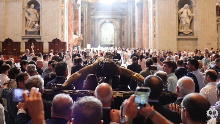 Los trianeros cargando la imagen de Cristo en la basílica vaticana.