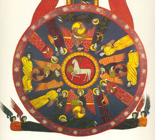 Tetramorfos sobre las «ruedas» y apostolado rodeando al Cordero (Beatus)
